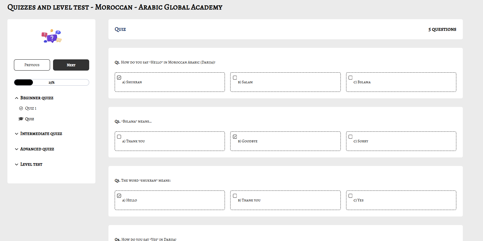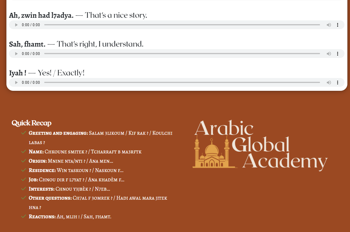 Yes! They start with the basics: greetings, simple vocabulary, and pronunciation (like the “g” for “qaf” or Maghrebi accents). The modules gradually progress to natural dialogues, with exercises tailored to all levels.
