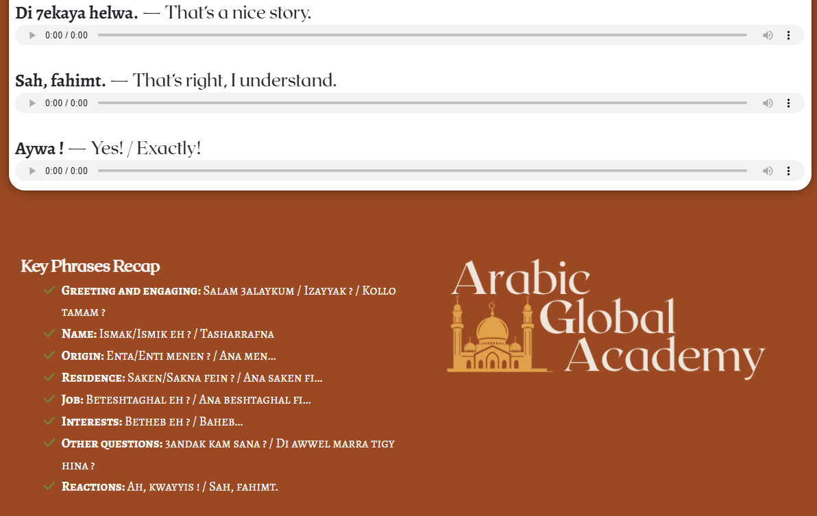 At Arabic Global Academy, we focus on gamification! Having fun is key to learning a language. Challenge yourself with quizzes on Egyptian Arabic and test your level.